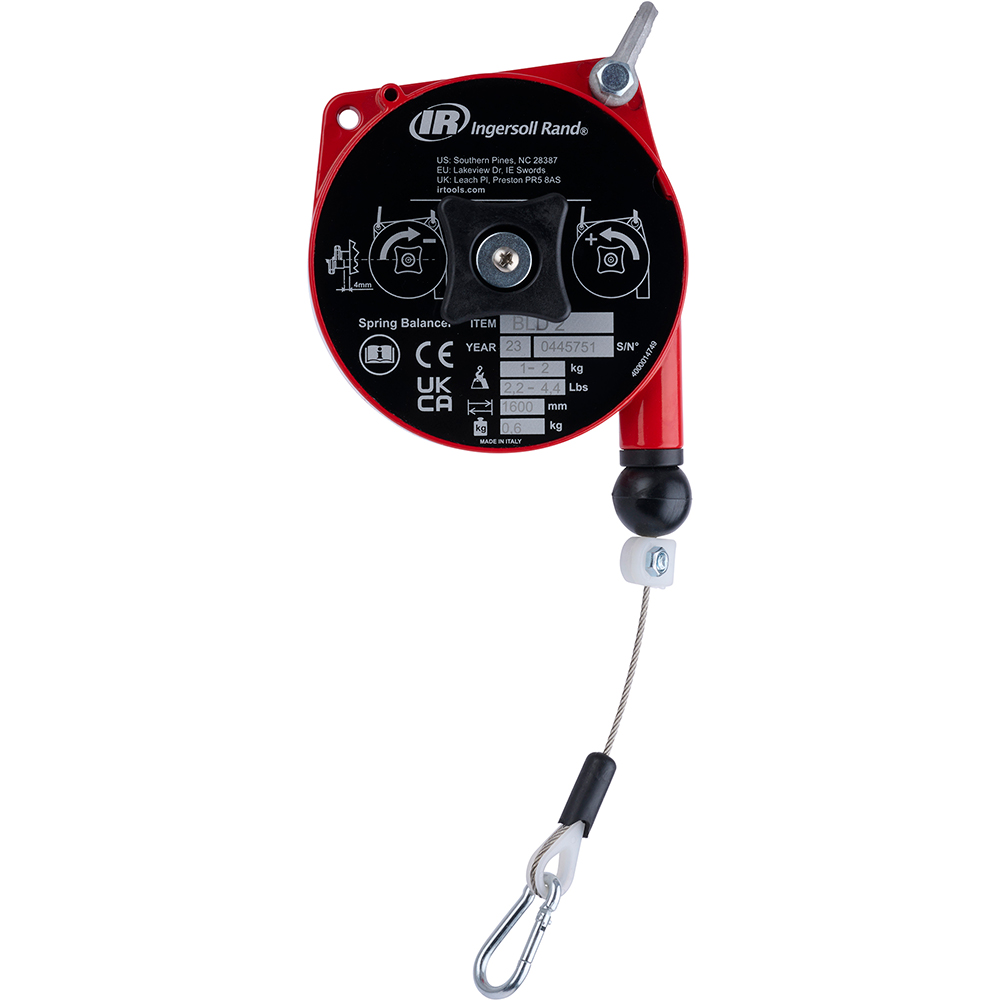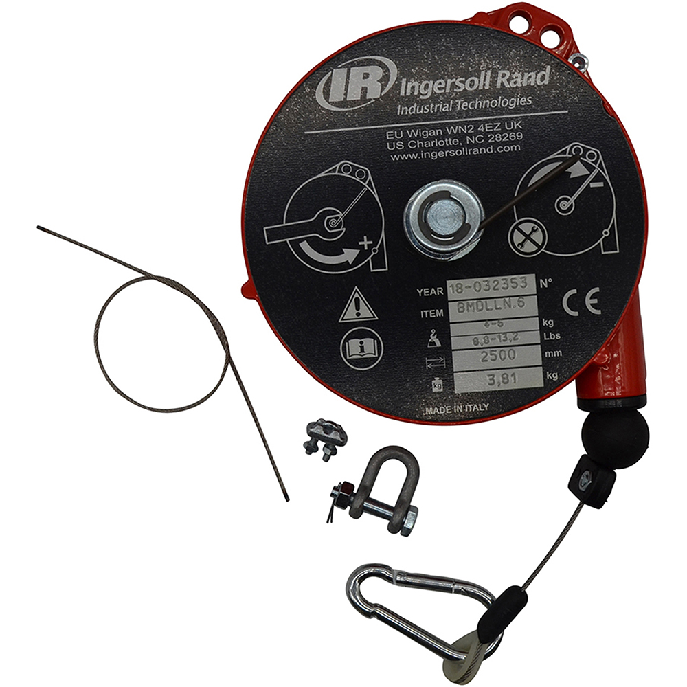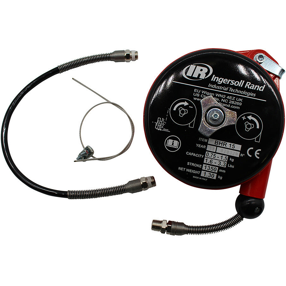 Built with user-focused innovation, the Ingersoll Rand BHD-15 22-33lbs Heavy Duty Spring Balancer provides several key advantages: Stainless steel cable and anti-friction cable guide. Gravity-free suspension capability. Ribbed and sealed monobloc construction in aluminum alloy. Safety device against load dropping due to the spring breakage (>6.5lbs). Locking device to block the load at any height. Upper rotary suspension with safety hook. Adjustable stroke limiting device.